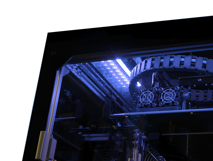 通过Wiiboox自带的软件,您可以自定义打印照明、预热提示等灯光色彩方案,LED灯光共有红、紫、蓝三种颜色可供选择。
