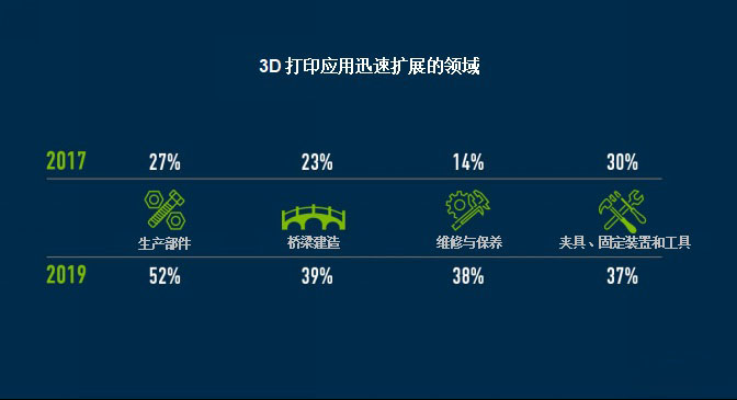 仅在短短两年内,3D打印技术在桥梁建造方面的应用就增长了70%。同期,汽车、运输和重型设备等行业也在广泛使用这项技术。
